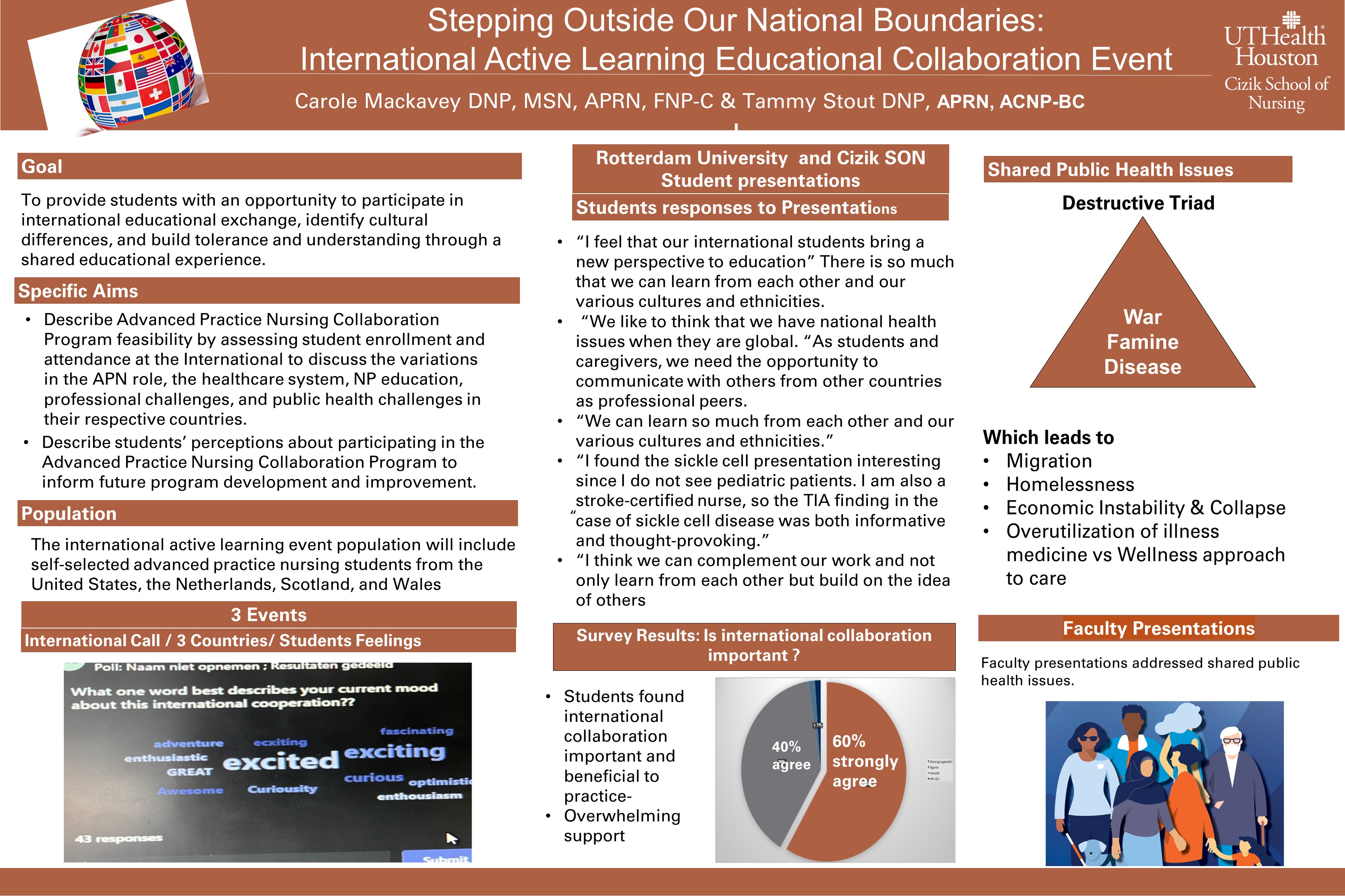 Purpose: Nursing and advanced nursing education differ from country to country, as does the advanced practice nurse's role. This international active learning program aspires to help students better understand their role in global citizenship and increase their awareness of social, cultural, and political differences affecting health disparities. This program aims to engage students from the United States, the Netherlands, Scotland, and Wales in a series of International Advanced Practice Nursing Collaborative Events to discuss the variations in the advanced practice role, the healthcare system, NP education, professional challenges, and public health challenges in their respective countries