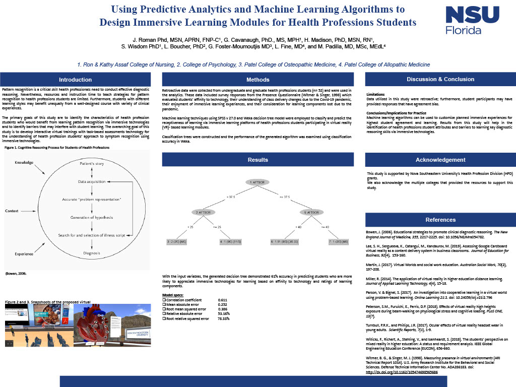 Prior to recruitment, machine learning techniques using SPSS v 27.0 and WEKA decision tree model were employed to classify and predict the receptiveness of learning via immersive learning platforms of health professions students participating in virtual reality (VR)- based learning modules. Retroactive data used in these analytics were collected from undergraduate and graduate health professions students. Surveys were prepared to evaluate the students’ affinity to technology, their understanding of class delivery changes due to the Covid-19 pandemic, their enjoyment of immersive learning experiences, and their consideration for learning components that are lost due to the pandemic. In WEKA, classification trees were constructed, and the performance of the generated algorithm was examined using classification accuracy.