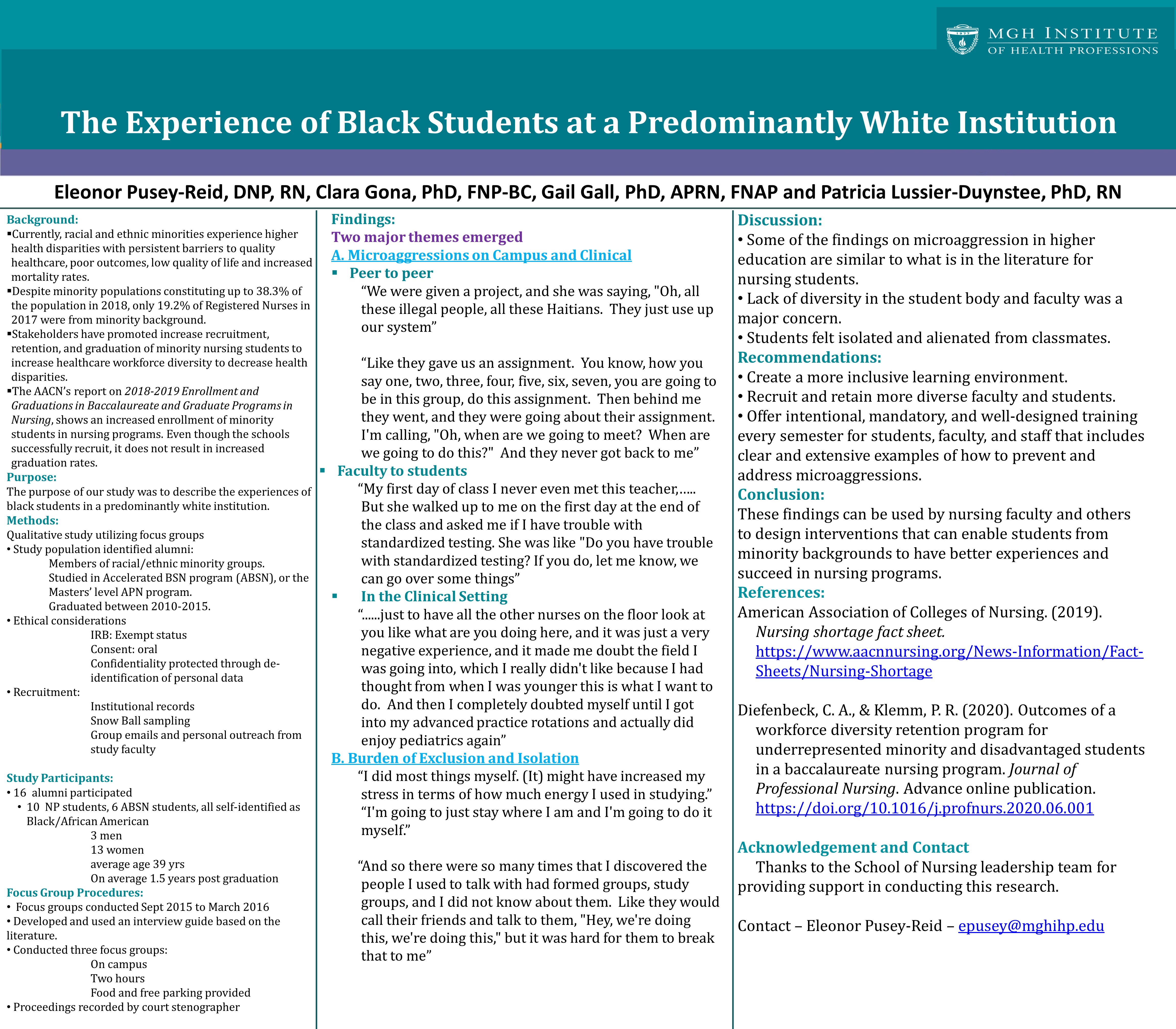 The AACN’s report on 2018-2019 Enrollment and Graduations in Baccalaureate and Graduate Programs in Nursing, shows an increased enrollment of minority students in nursing programs. Even though the schools successfully recruit, it does not result in increased graduation rates. The purpose of our study was to describe the experiences of black students in a predominantly white institution. We conducted 3 focus group interviews with 16 Black alumni from the accelerated Baccalaureate (ABSN) and Direct Entry Master’s (DEN) programs. Two major themes emerged; microaggressions on campus and clinical and the burden of exclusion and isolation. These findings can be used by nursing faculty and others to design interventions that can enable students from minority backgrounds to have better experiences and succeed in nursing programs. Results from the focus group interviews will be presented.