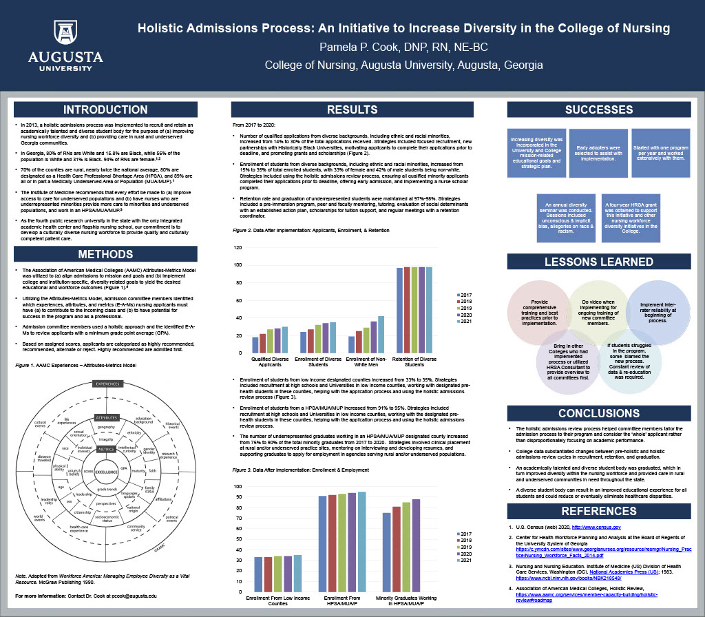 Pamela Cook, DNP, RN, NE-BC, serves the CON as the Interim Academic and Student Affairs Associate Dean, and Professor in the College of Nursing and The Graduate School. In her role she oversees recruitment, enrollment, registration, orientation, grading and development, curriculum development, evaluation of new academic programs, and manages all student issues and concerns. She has served as PI of seven HRSA grants and Co-Investigator for additional HRSA grants. She has been a diversity champion within the College and University serving on multiple committees and assisting with implementing many diversity strategic initiatives such as the holistic admissions process.