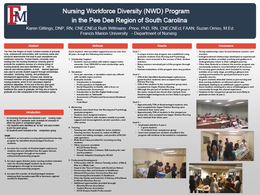 Karen K. Gittings, DNP, RN, CNE, CNEcl, Alumnus CCRN is a professor of nursing and Dean of the School of Health Sciences at Francis Marion University, Florence, South Carolina. Dr. Gittings received her diploma in nursing from The Washington Hospital School of Nursing, Washington, Pennsylvania and her BSN from the University of Maryland, Baltimore County. She earned her MSN with specialization in nursing education and her DNP at Duquesne University in Pittsburgh, Pennsylvania. She was a 2015 to 2016 Amy V. Cockcroft Fellow and a recipient of multiple Outstanding Faculty Teaching Awards and the South Carolina Palmetto Gold Award (2005).