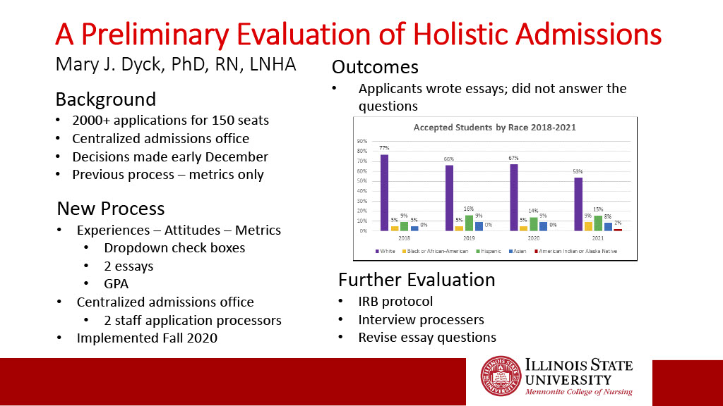 Dr. Dyck received her BSN from Goshen College, MSN from the University of Virginia, and PhD in gerontological nursing research from the University of Iowa. Since 2003 she has studied quality of care in Illinois nursing homes. Dr. Dyck has been an RN for over 40 years, including 6 years as a nursing home administrator. She has worked as a staff nurse, clinical nurse specialist, faculty, and consultant in long-term care. She served on the board of directors of a retirement community for 9 years. She has been the Project Director on a HRSA funded Nursing Workforce Diversity grant.