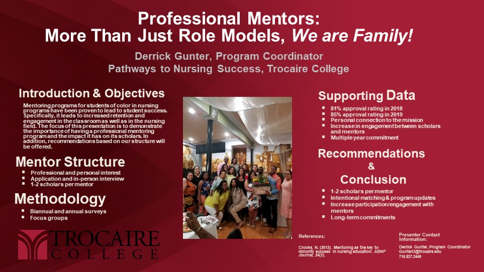 Derrick has had a rich career in higher education, focusing on access and equity issues in education. He has worked with youth in high school, college, and graduate school to ensure they successfully obtain their degree. Currently, he serves as the Program Coordinator for the Pathways to Nursing Success Program at Trocaire College. Derrick provides numerous services to the scholars that he serves, such as academic support, financial literacy, career counseling, and graduate school preparation.