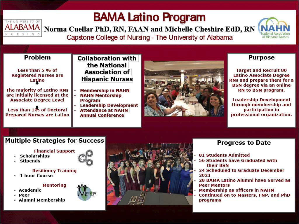 Dr. Cuellar is a faculty member at University of Alabama and the immediate past president of the National Association of Hispanic Nurses. During her presidency, she has been committed to promoting education in Latino nurses, especially in advanced practice roles where the need of Latino practitioners is at its greatest shortage.