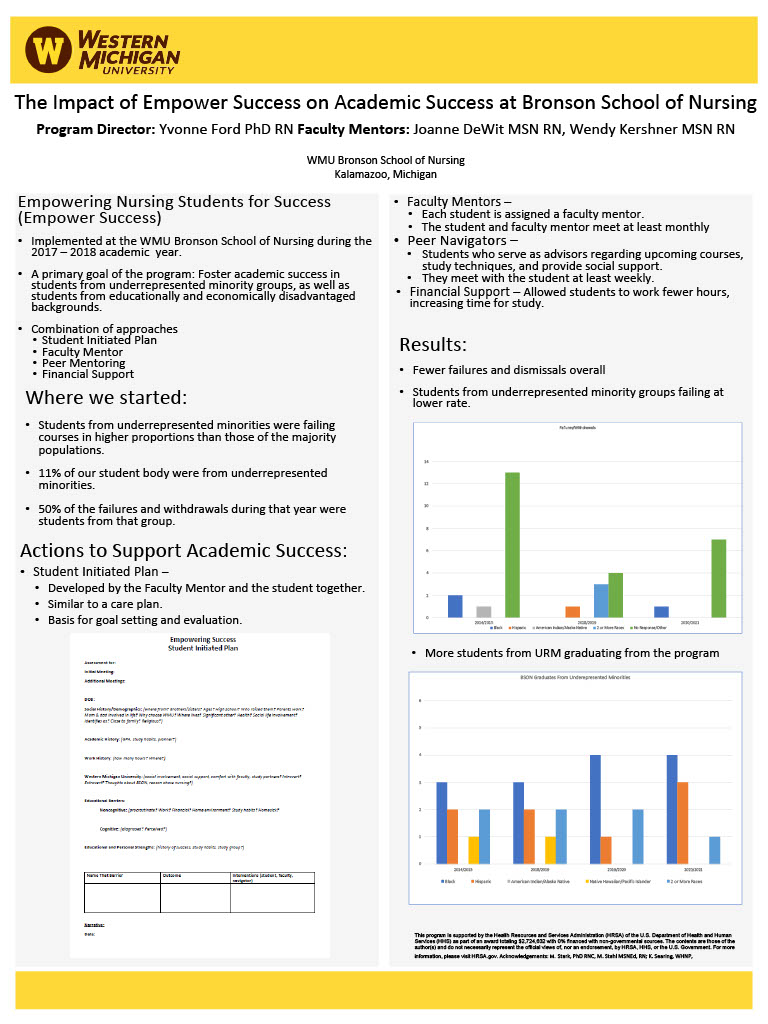 Dr. Yvonne Ford earned BSN, MS, and PhD degrees in nursing from the University of Michigan School of Nursing. Her clinical background is in perioperative nursing and nursing management. Dr. Ford has been on the faculty of the Bronson School of Nursing since 2009. She served as Undergraduate Program Coordinator from 2014 – 2019. Dr. Ford also served on the team that wrote the HRSA funded Empowering Nursing Students for Success (Empower Success) in 2017. She assumed the role of Program Director for Empower Success in Fall 2019 upon the retirement of the founding Program Director.