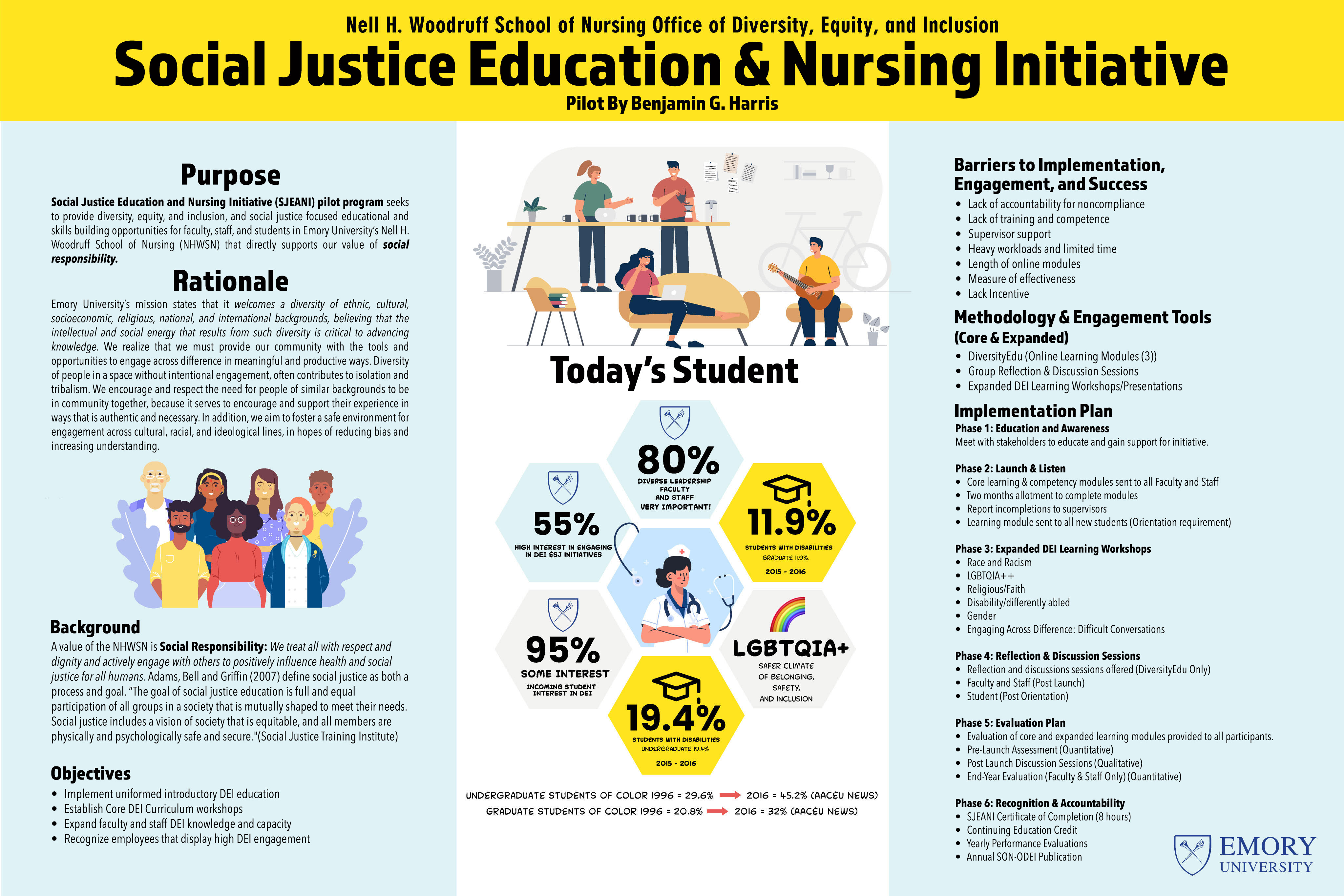 Benjamin Harris is the Director of Diversity, Equity, and Inclusion at Emory University’s Nell H. Woodruff School of Nursing. In this appointment he co-leads the Office of Diversity, Equity, and Inclusion, as he strives to ensure social justice becomes more central to the overall progress and long-term success of the School. For over 16 years, Benjamin has served in various roles leading diversity, equity, and inclusion efforts at both large and small institutions of higher education. Benjamin holds a Bachelor of Arts in Communication Studies and Sociology from Elmhurst College and a Master of Science degree from Illinois State University.