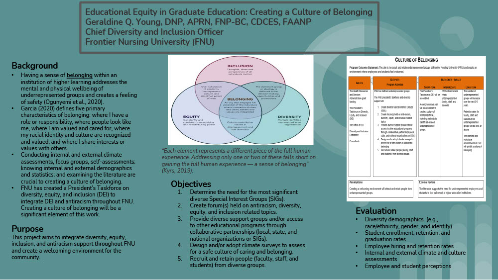 Dr. Young holds a DNP from the University of Alabama at Birmingham (2010), an MSN from Alcorn State University (2005), and a BSN from the University of Mississippi Medical Center (2001). She is a board-certified family nurse practitioner and certified diabetes care and education specialist (2011). Her career spans over 20 years as a clinician, faculty member, leader, scholar, and servant in the nursing profession. Dr. Young is passionate about her work. She is continuing on her trajectory of building a diverse, equitable, inclusive, and antiracist healthcare delivery system as the Chief Diversity and Inclusion Officer at Frontier Nursing University.