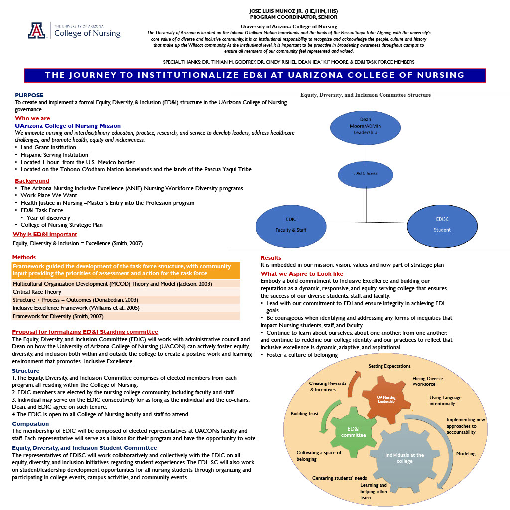 José Muñoz is a Senior Program Coordinator at the College of Nursing who works with doctoral and graduate certificate students. Serving on the Arizona Nursing Inclusive Excellence team, he coordinates programming to support graduate students. José is the co-chair of the Equity, Diversity, and Inclusion (ED&I) Task Force, leading the ED&I efforts at the College of Nursing. Previously, José held roles in Leadership and Development with Kansas Athletics, managing student-athlete development, among other diversity initiatives.