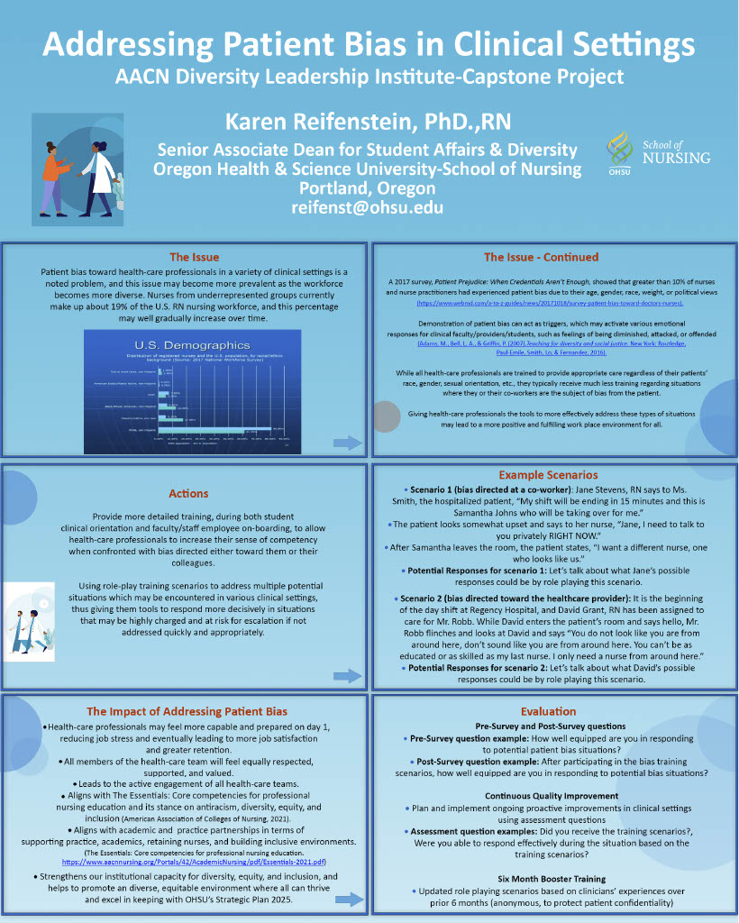 Dr. Reifenstein received her undergraduate degree from Hampton University and a master’s degree in pediatrics and nursing administration from Wagner College. A former pediatric nurse and director of nursing for a home health agency, Dr. Reifenstein obtained her Ph.D. in nursing research from the University of Rochester. She later completed a postdoctoral fellowship at Oregon Health and Science University in Portland, Oregon, focusing on Research in Individual and Family Symptom Management. Dr. Reifenstein currently serves as the Senior Associate Dean for Student Affairs and Diversity at Oregon Health and Science University, School of Nursing.