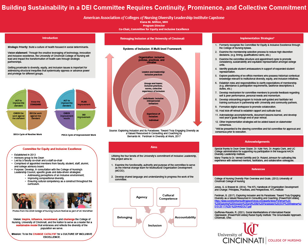 As a University of Cincinnati Diversity & Inclusion Resource Liaison and College of Nursing Co-chair for the Committee of Equity and Inclusive Excellence, Kiana Million leads efforts to increase student, faculty, and staff engagement by generating educational experiences to galvanize action and accountability for inclusive excellence. Ms. Million earned a Bachelor of Business and Master of Health Informatics from the University of Cincinnati. A consistent learner, she explores the realms of intersectionality as a college-educated, woman of color, working in academia. Ms. Million has supported student, faculty, and UC College of Nursing program success for over 20 years.