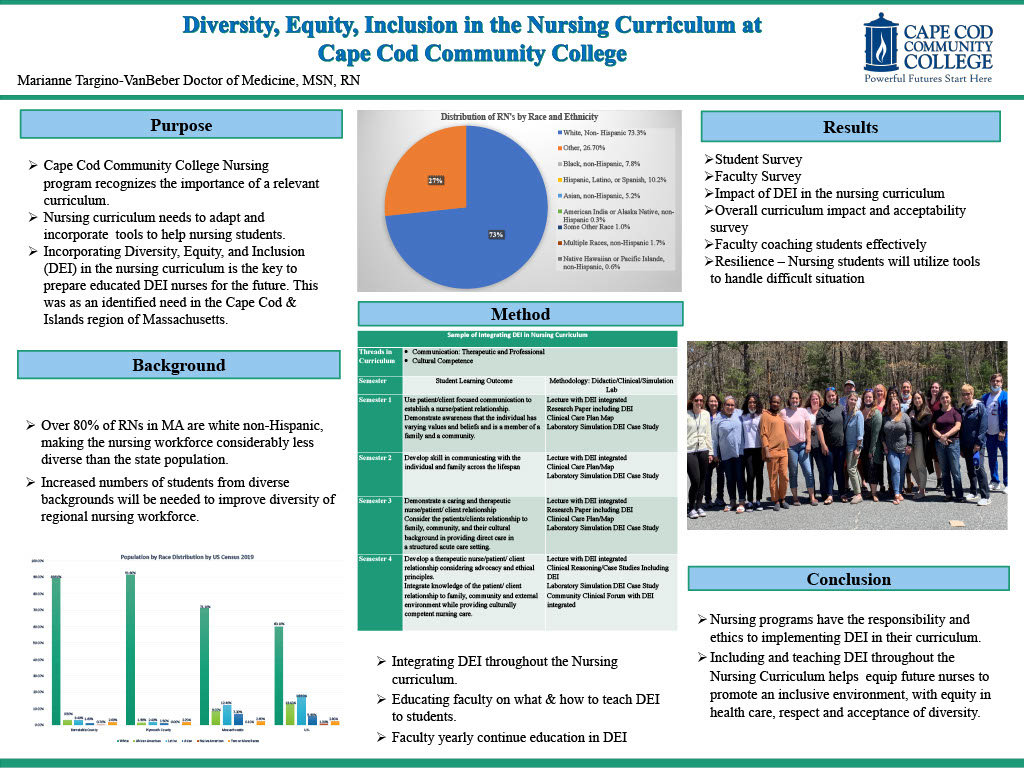 Her role as the Nursing curriculum committee chair complements her passion in creating a Nursing curriculum with Diversity Equity and Inclusion throughout the curriculum. Promoting nursing workforce diversity by recruiting underrepresented minority, economically and academically disadvantaged students into the Cape Cod Community College Nursing Program and promoting culture awareness is a privilege for her.
