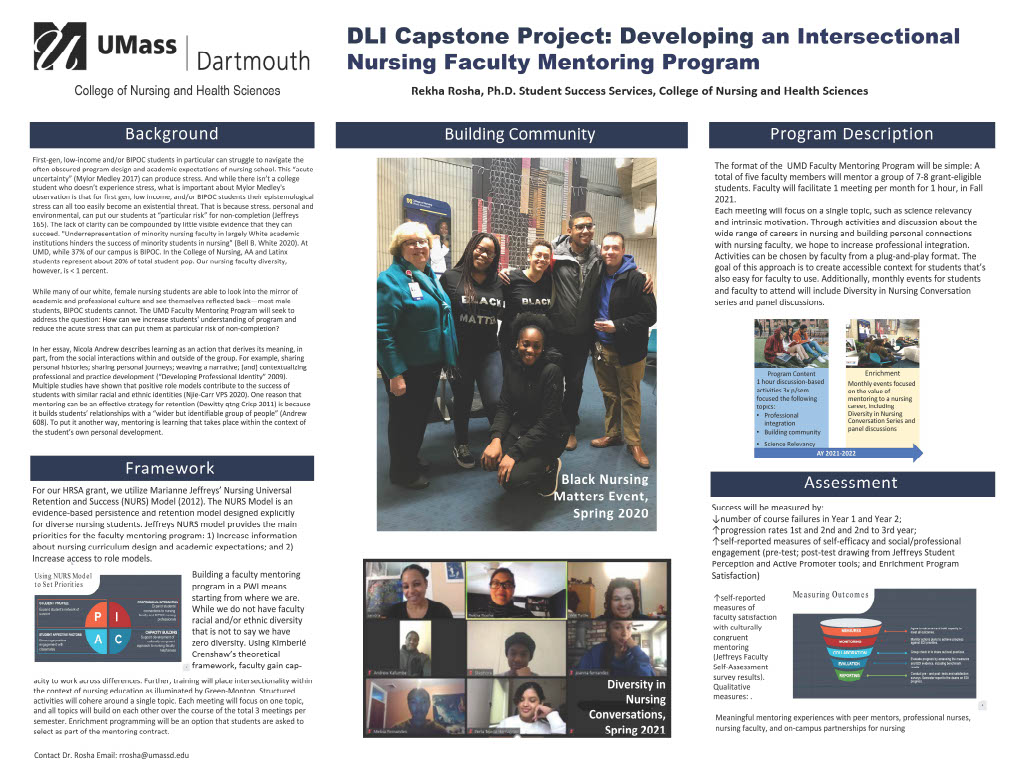 Dr. Rosha holds advanced degrees from The University of Vermont and Brandeis University. Dr. Rosha began her career inside the college classroom teaching American literature and composition. Having been a first-generation and low- income college student, and based on her research on class and capital, she discovered a love of academic advising, and for the past seven years has worked on increasing persistence and retention among first-generation, low-income, and BIPOC students. Currently she provides holistic supports to URM nursing students in the College of Nursing and Health Sciences, University Massachusetts Dartmouth, in support of the HRSA workforce development grant.