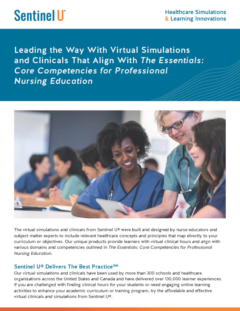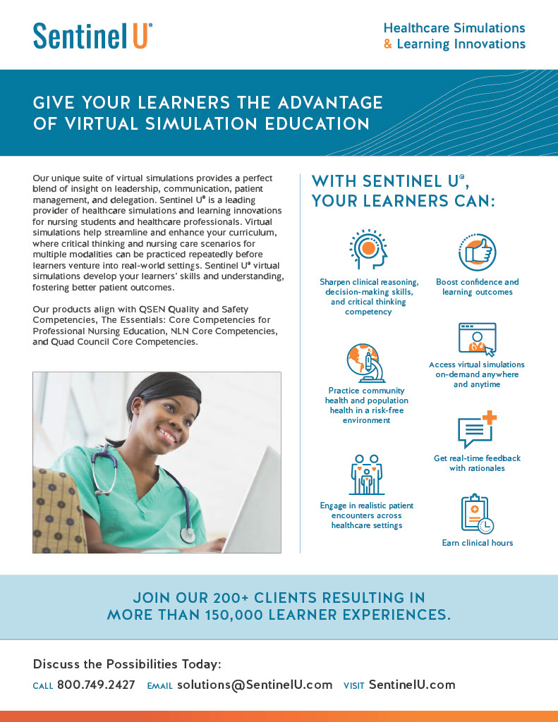 Sentinel U® is a leading provider of health care simulations and learning innovations for nursing students and healthcare professionals. Its authentic virtual simulations and clinical experiences are the best practice in engaging learners in real-world scenarios to gain unparalleled clinical judgement and critical thinking experience. Sentinel U is an industry leader in virtual simulation education for more than 130,000 annual learner experiences worldwide. To learn more about Sentinel U® and its full portfolio of virtual simulation products, visit www.sentinelu.com.